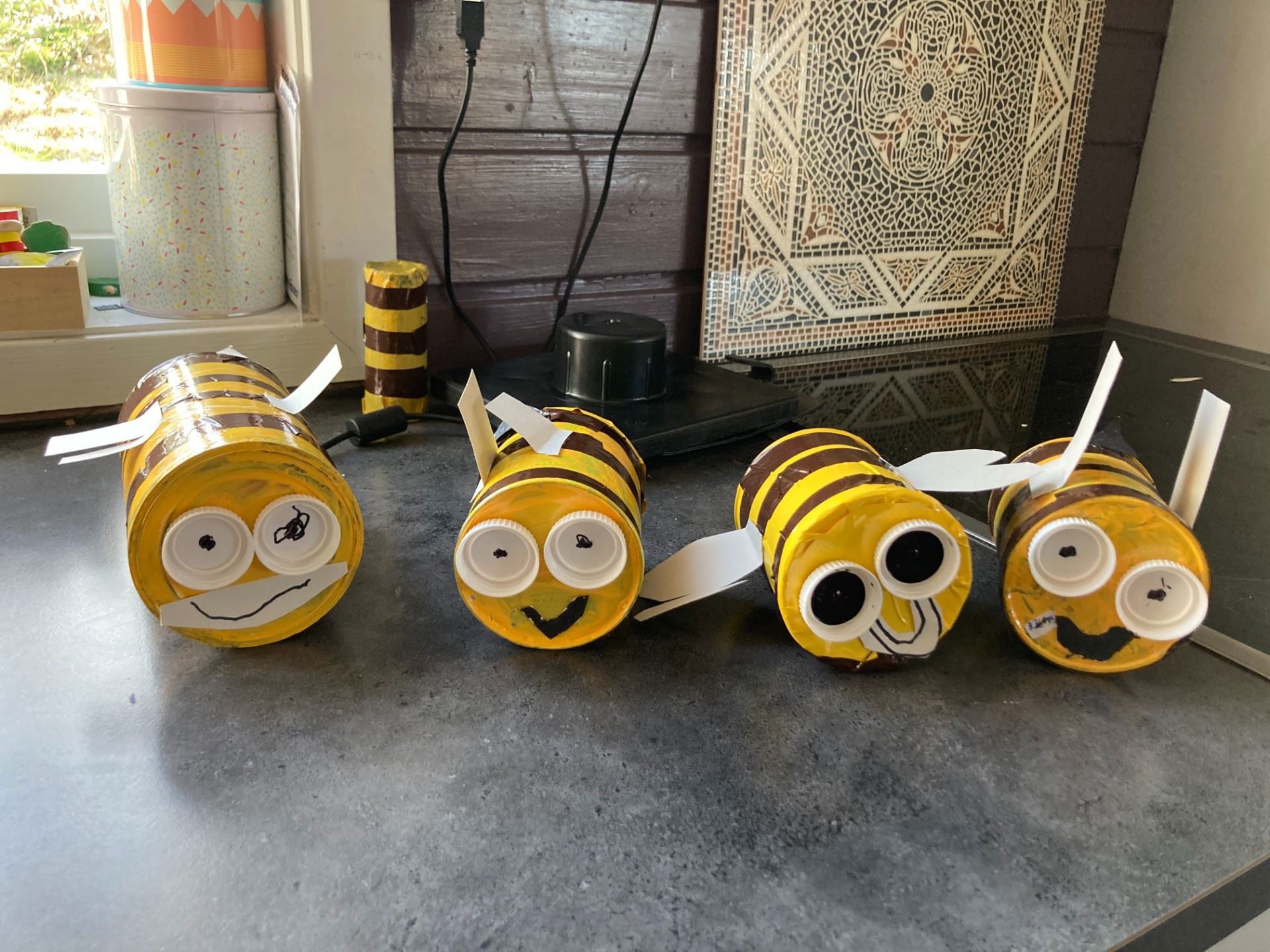 På Forglemmegei er tema nå bier. Vi har tatt inn en tom bikube på avdelingen. Det lages bier i ulike former. Noen av do rull, noen i ull, noen males, klippes eller tegnes. Da får vi prøvd oss med ulike typer materiale. Vi leser om bier og snakker masse om det. Barna spør og lærer fort. De har også smakt på ulike typer honning.