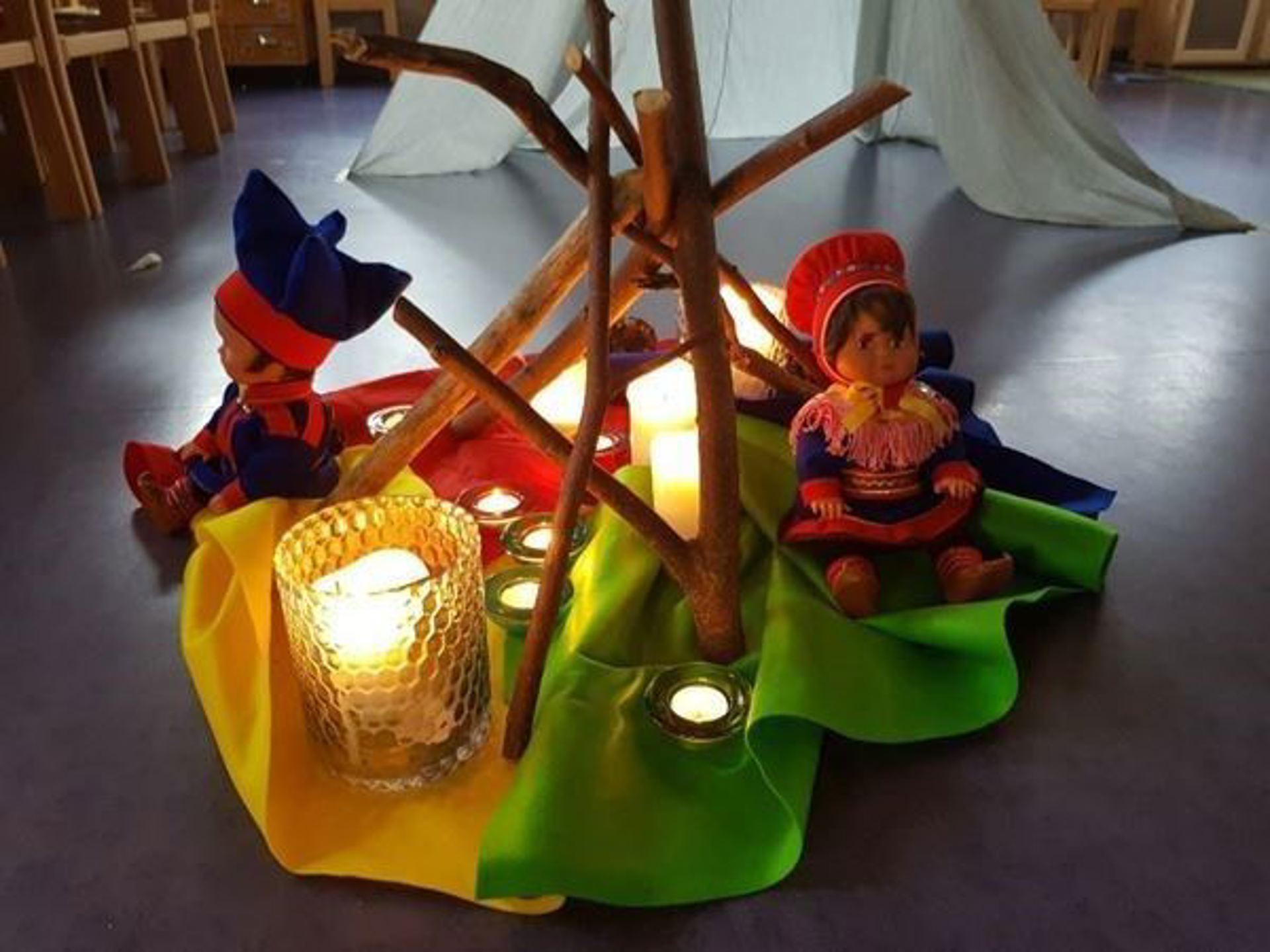 Vi lærer litt om samene i forbindelse med samenes dag. Vi ser på bilder av samer, drakter, rein osv. Det som er gøyest er kanskje og høre joik. Vi har lagd lavvo på uteområdet som var veldig moro og leke i. Barna har blitt kjent med fargene i flagget. Tema ble avsluttet med en forestilling av de voksne på Forglemmegei. De spilte for hele barnehagen. Det var en kråke, en rev og en dompap som måtte lære og være snille med hverandre.