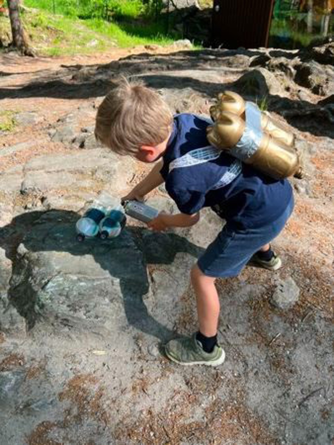 Planet prosjektet vårt tar litt tid. Nå er vi i gang med å lage romstasjon. Da må vi jo også ha luftflasker til å ha på ryggen. Da sprøytmalte vi flasker og satt de sammen. Jobbe med sprøytelakk var stas. Barna har det også veldig moro med å reise på tur i verdensrommet med romstasjonen vår.