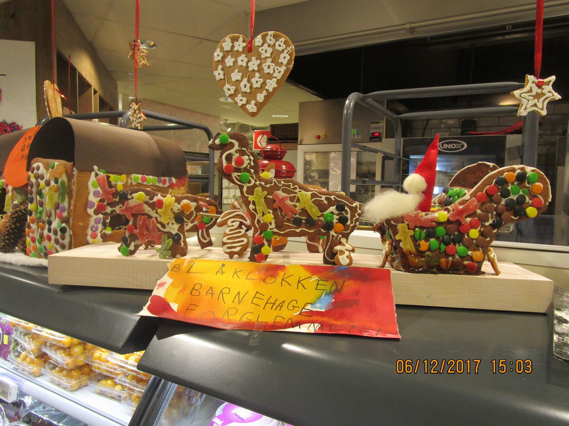 De store barna på Forglemmegei har laget en pepperkakeslede som er utstilt på Meny på Krøgenes. Da har vi fått smakt, kjent på, formet og uttrykket oss estetisk.